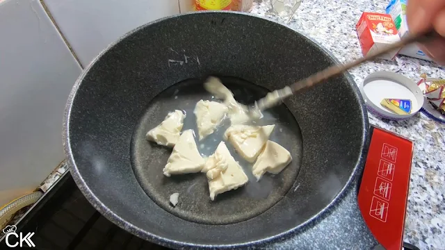 - Cho sữa đặc vào chảo phô mai, bật lửa nhỏ, khuấy đều cho sữa đặc tan hết. Cho tiếp sữa tươi vào, vừa nấu vừa khuấy cho hỗn hợp ấm lên là được.