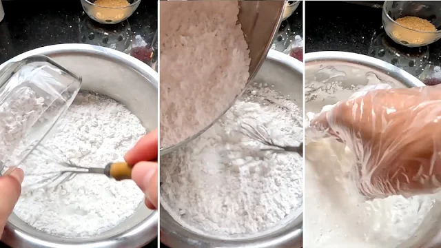 - Khuấy tan nước ấm với nước cốt dừa và xíu muối. Cho bột nếp và bột gạo vào, khuấy đều rồi nhồi 10 - 15 phút.